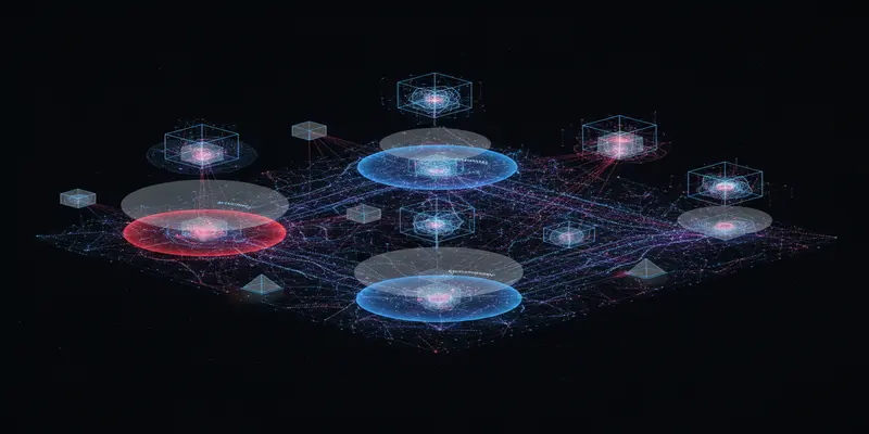 Dark mode visual featuring a particle-network system visualization representing AI data flows. Key clusters represent security domains with overlapping zones tinged in red (risk), blue (governed), and gray (unknown AI components). Emphasize interconnected threat surfaces and abstract AI nodes — use an isometric 3D architecture view with elevated AI model clusters to represent unmanaged vs. monitored zones. Style: high-detail, CISO-appropriate, no humans or text.